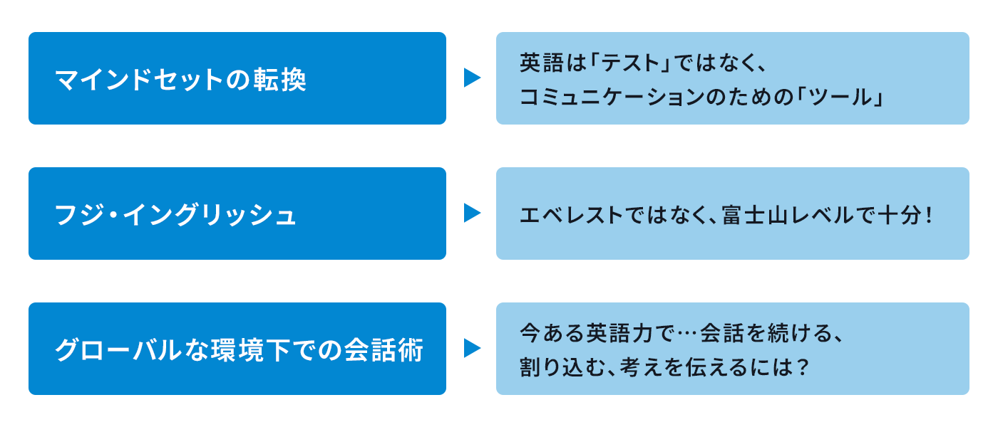 受講者の英語に対する苦手意識を払拭し、今の英語力でも「伝えることができる」という自信の体得を目指します。